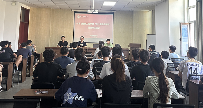 在经验分享环节,范轩瑞以“从校园到职场的蜕变”为题,讲述了自己突破专业限制成功求职的经历。他强调了拓宽知识面、积累实习经验、在求职中突出自身优势的重要性,并介绍了体育专业员工可关注的就业方向,如公安系统考试、中小学体育教师及考研深造等,指出了本校体育专业优势及教团队格证的必要性。