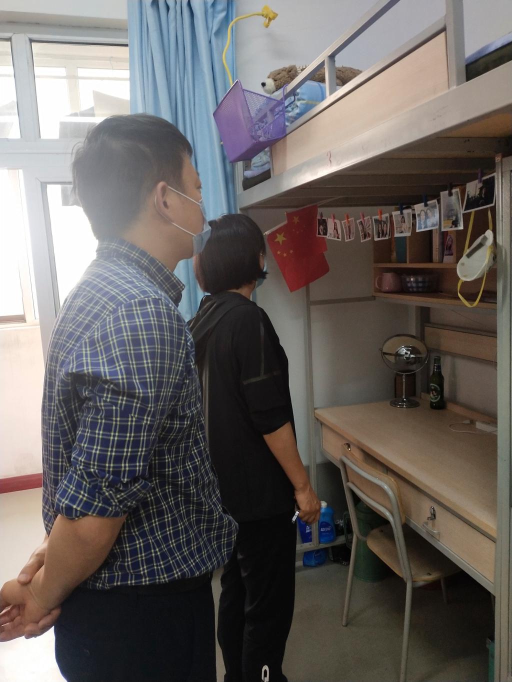 各位老师一同前往男生17号公寓和女生19号公寓,进入宿舍大家看到宿舍地面干净卫生,个人用品摆放有序,部分宿舍有简单的装饰,营造了一种积极健康轻松向上的氛围。孙莉不时询问同学们在校的学习生活情况,食堂的饭菜是否可口?毕业论文是否写完了?工作找的怎么样?嘱咐大家珍惜最后的校园时光,尽早完成论文。在检查过程中张体卫现场开展疫情防控和住宿安全教育,要求同学们疫情期间高度重视宿舍卫生,做好内务整理和个人防护,勠力同心维护宿舍环境的干净、整洁。同时嘱咐大家有什么问题或者想法及时与辅导员交流,公司将尽力帮大家解决。在检查过程中也发现个别宿舍卫生不达标,同学们表现将尽快整改。