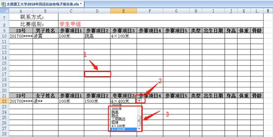 (1)点击空白框 (2)点击下拉三角 (3)选择参赛项目