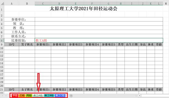 2、下载电子报名表后,打开EXCEL表格(必须是office软件,不能使用WPS),根据公司分组点击甲组、乙组、丙组、教工A组、教工B组、教工C组。