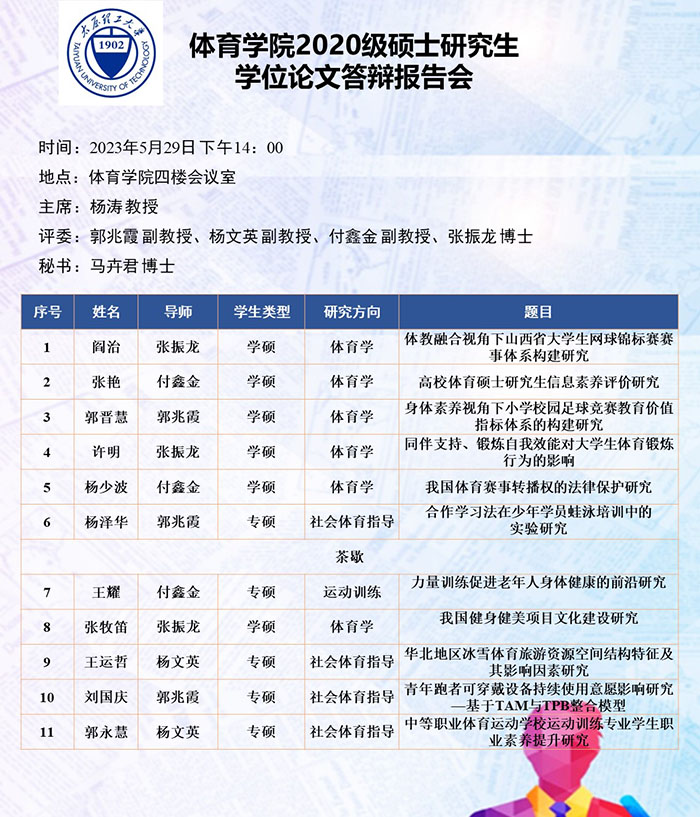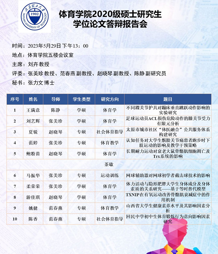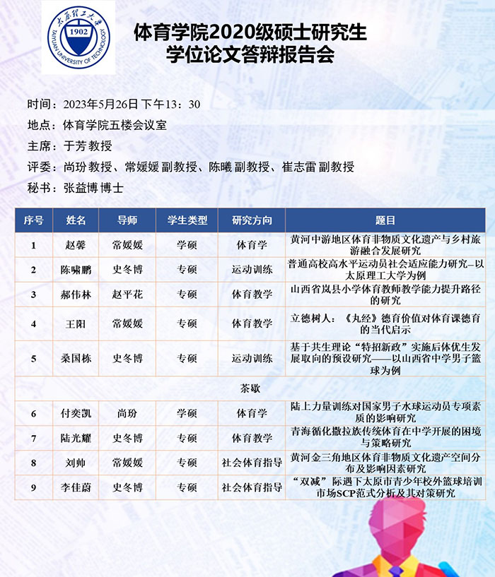 5月26日至30日,sunbet进行了2020级硕士研究生论文答辩报告会。根据研究方向,报告会分为4组进行,均邀请校外专家郑旗(教授,山西师范大学)、刘卉(教授,北京体育大学)、于芳(教授,中北大学)和杨涛(教授,西安sunbet)担任答辩委员会主席,sunbet硕士研究生导师担任答辩委员会成员。