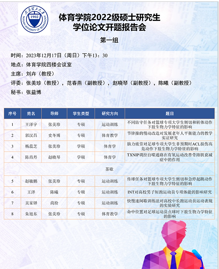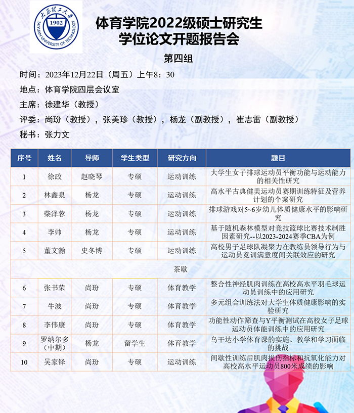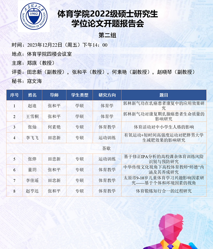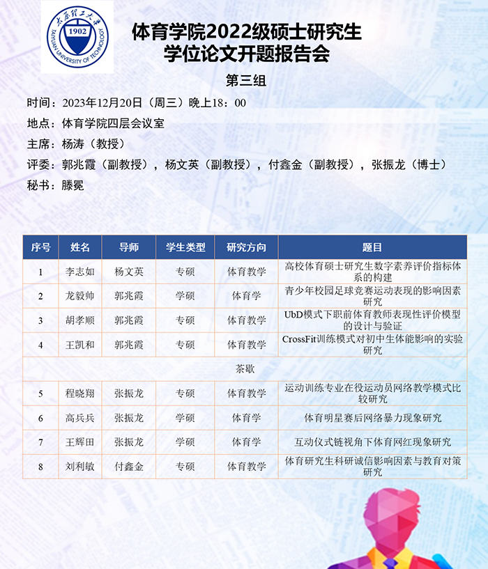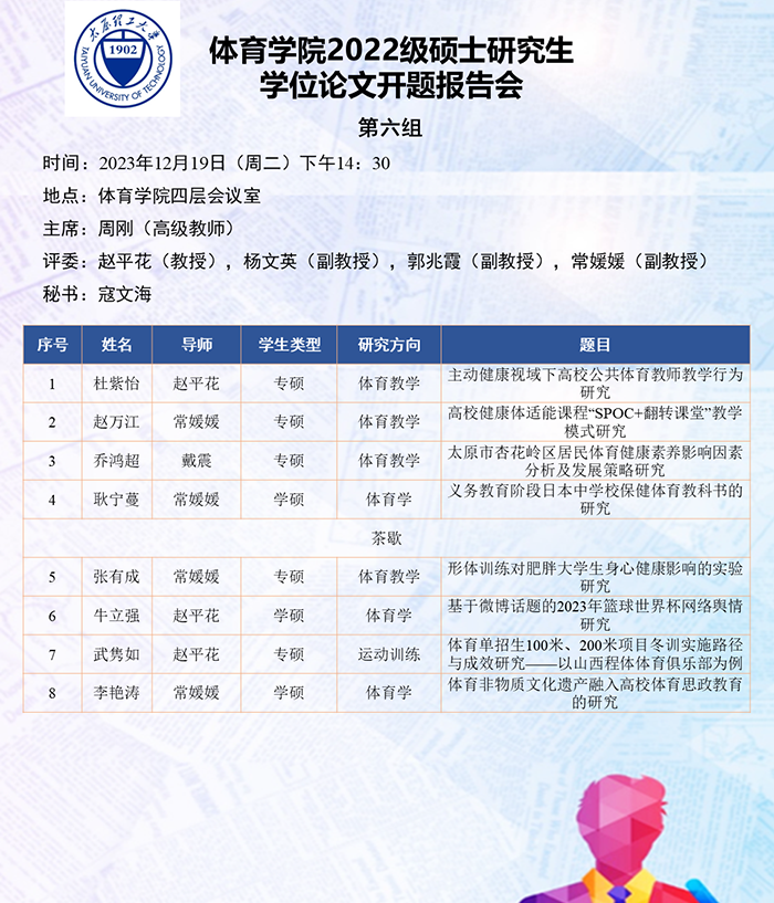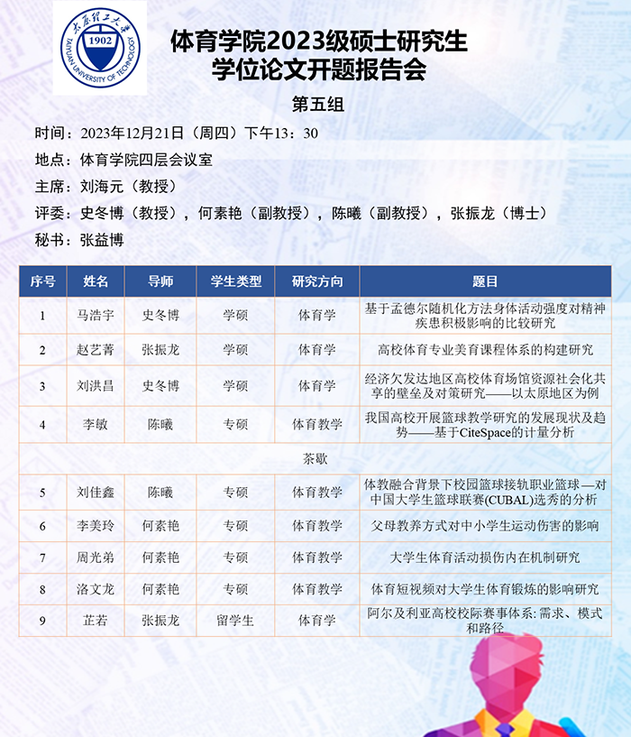 根据研究方向,报告会分为6组进行,分别由史冬博、田忠新、尚玢、张美珍、赵平花、郭兆霞担任组长,由校外专家刘海元(教授,首都sunbet)、郑旗(教授,山西师范大学)、徐建华(教授,福建师范大学)、刘卉(教授,北京体育大学)、周刚(高级教师,太原市教研科研中心)和杨涛(教授,西安sunbet)担任答辩委员会主席,由sunbet硕士生导师担答辩任委员会成员,共同完成了此次开题答辩报告会。