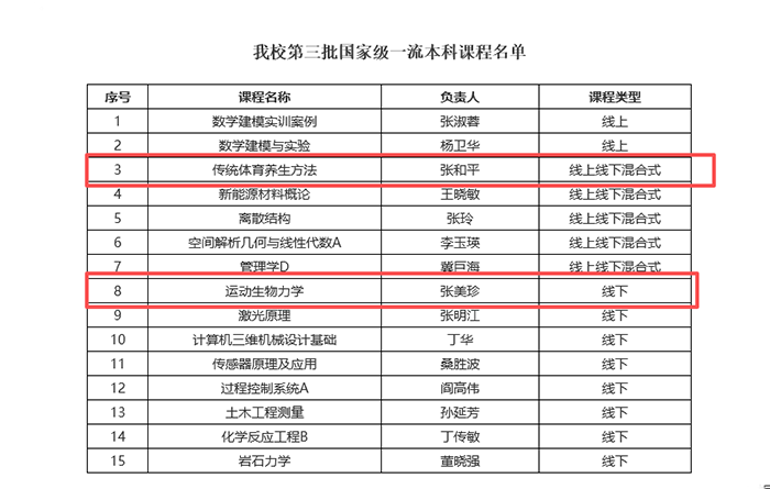 8月21日,教育部高等教育司公布《关于第三批国家级一流本科课程认定结果的公示》,公司张美珍教授团队的《运动生物力学》(线下一流课程)和张和平教授团队的《传统体育养生方法》(线上线下混合式一流课程)成功获批,实现了公司国家级一流本科课程零的突破,标志着公司在本科课程建设方面取得新的突破。