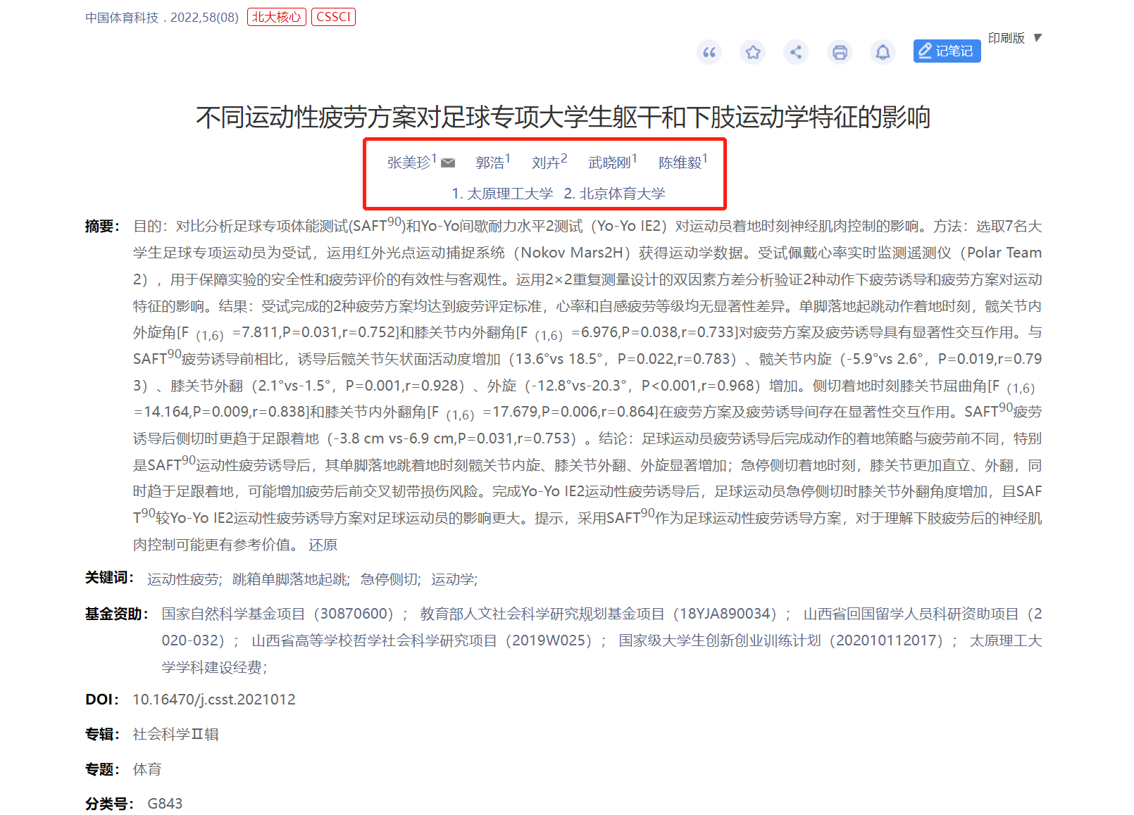 公司教师张美珍教授的研究成果《不同运动性疲劳方案对足球专项老员工躯干和下肢运动学特征的影响》在《中国体育科技》(2022年第8期)发表。中国体育科技由国家体育总局主管,国家体育总局体育科学研究所主办,多年来一直是中文体育类核心期刊、中国人文社会科学核心期刊、CSSCI来源期刊,中国社科院期刊评价报告评为核心期刊。该论文是张美珍教授(第一作者)与北京体育大学刘卉教授、sunbet申搏陈维毅教授团队的合作成果,sunbet申搏sunbet为第一署名单位。