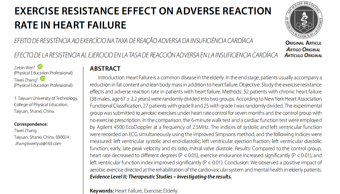该论文将52例患有慢性心力衰竭患者随机分为进行控制心率的有氧运动的实验组与无运动处方的对照组进行实验。结果表明,通过有氧运动、高强度间歇训练和耐力运动可以显著改善心力衰竭患者的心功能和生活质量。特别是在运动前后左心室功能指标方面有了显著提升。