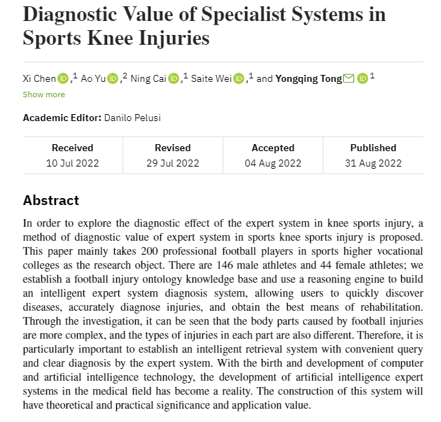 公司教师佟永清副教授、陈曦副教授的研究成果《Diagnostic Value of Specialist Systems in Sports Knee Injuries》在《Scanning》(2022年8月)发表。该刊已被国际权威数据库SCIE、SCI收录,该刊致力于发表经过严格同行评审的高质量原创文章,反映工程技术与跨学科融合领域的新进展、新技术、新成果,促进学科交叉与融合领域科研交流和科研成果转化。该论文是佟永清副教授(通讯作者)、陈曦副教授(第一作者)与韩国又石大学Hyunchoul CHO教授团队合作的成果,sunbet申搏sunbet为第一署名单位。