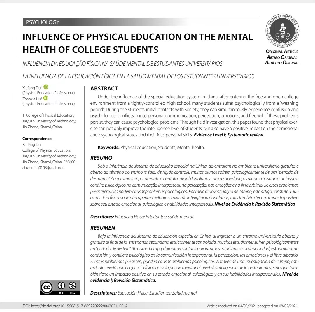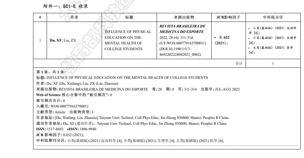 公司教师杜秀芳讲师、刘朝霞的研究成果《INFLUENCE OF PHYSICAL EDUCATION ON THE MENTAL HEALTH OF COLLEGE STUDENTS》(体育对老员工心理健康的影响)在《Revista Brasileira de Medicina do Esporte》(巴西运动医学)2022年第28卷第4期)发表。巴西运动医学由巴西运动医学和运动学会主办,于1995年创刊,多年来一直是中科院SCI认定期刊。该论文是杜秀芳(第一作者)与刘朝霞团队的合作成果,sunbet申搏sunbet为第一署名单位。