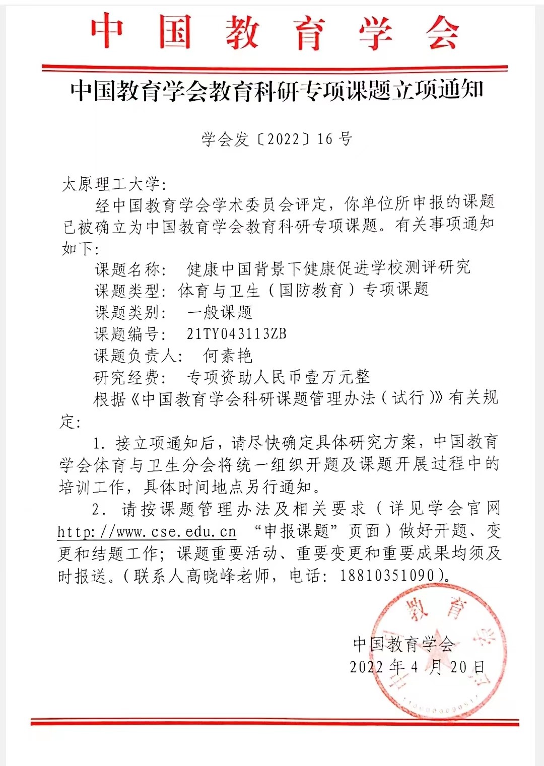 喜报:何素艳副教授获批中国教育学会教育科研专项课题