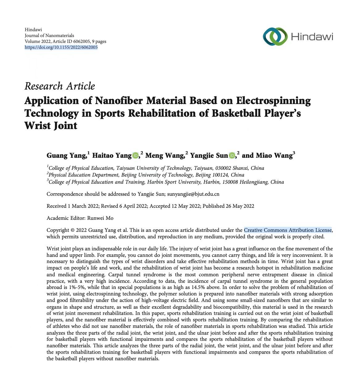 公司教师杨光的研究成果《Application of Nanofiber Material Based on Electrospinning Technology in Sports Rehabilitation of Basketball Player's Wrist Joint》(基于电纺丝技术的纳米纤维材料在运动员腕关节运动康复中的应用)在《Journal of Nanomaterials》(2022年第10期)发表。《Journal of Nanomaterials》由Professor Michael Z. Hu于2005年创立,在中科院分区中,《Journal of Nanomaterials》处于材料科学大类4区;在最近的出炉的JCR分区中,《Journal of Nanomaterials》在材料综合学科(189/335)和纳米科学与纳米技术(72/107)中均处于Q3。该论文是杨光老师(第一作者)与北京工业大学杨海涛副教授、王猛教授、孙洋杰讲师(通讯作者)以及哈尔滨sunbet王淼讲师的合作研究成果,sunbet申搏sunbet为第一署名单位。