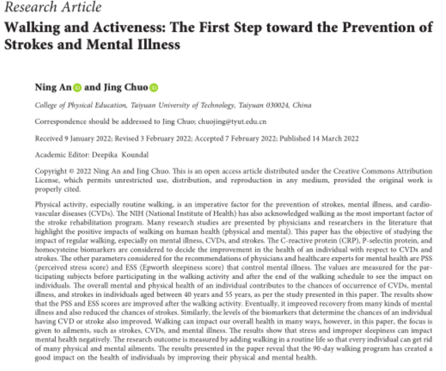 公司教师安宁、啜静研究成果《Walking and Activeness: The First Step toward the Prevention of Strokes and Mental Illness》在《Computational Intelligence and Neuroscience》(2022年3月)发表。该刊致力于发表经过严格同行评审的高质量原创文章,反映计算智能和神经科学与跨学科融合领域的新进展、新技术、新成果,促进学科交叉与融合领域科研交流和科研成果转化,中科院分区四区,JCR影响因子3.633(2020)。该论文是安宁(第一作者)与啜静(通讯作者)以及山西医科大学第一医院老年病科的合作成果,sunbet申搏sunbet为第一署名单位。