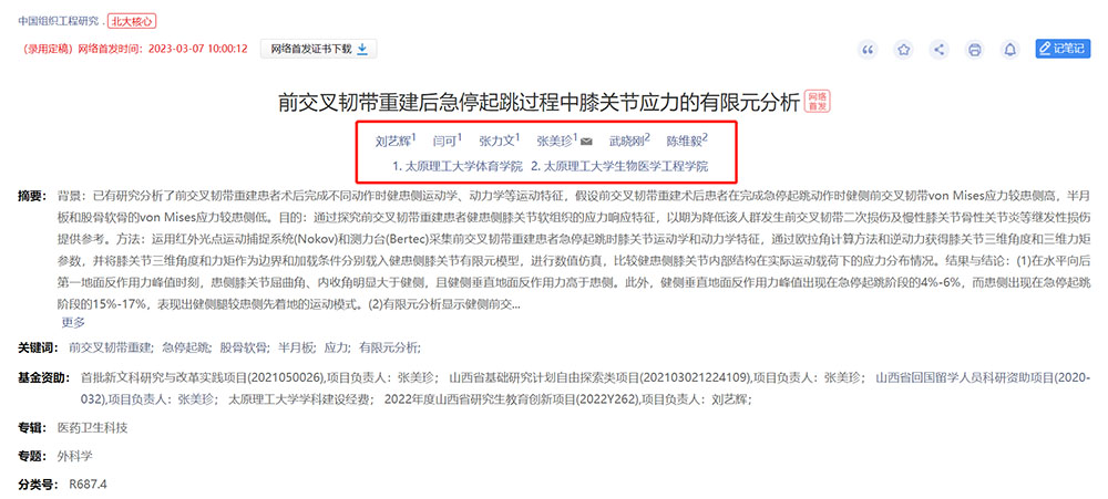 公司张美珍教授指导的硕士研究生刘艺辉的研究成果《前交叉韧带重建后急停起跳过程中膝关节应力的有限元分析》在《中国组织工程研究》上网络首发。《中国组织工程研究》杂志由中华人民共和国国家卫生健康委员会主管,中国康复医学会、《中国组织工程研究》杂志社主办,是目前国内专注组织工程研究的经同行评议的开放获取期刊,杂志曾多次被评为“中国百种杰出学术期刊”,国家新闻出版广电总局“全国第一批数字出版示范单位”,中国科技核心期刊,中国中文核心期刊。该论文是公司硕士研究生刘艺辉(第一作者)在导师张美珍教授(通讯作者)的指导下,与sunbet申搏陈维毅教授团队的合作成果,sunbet申搏sunbet为第一署名单位。
