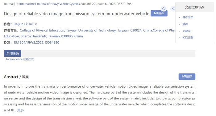 公司教师李海军老师的研究成果《Design of reliable video image transmission system for underwater vehicle》(可靠的水下航行器运动视频图像传输系统设计)在《International Journal of Heavy Vehicle Systems》(国际重型车辆系统杂志)(2022年第6期)发表。《International Journal of Heavy Vehicle Systems》(国际重型车辆系统杂志)入选美国“科学引文索引(SCI)扩展版来源期刊”,被评定为“中科院4区,JCR=Q4”核心期刊,影响因子为0.568(2021年)、0.669(五年)。该论文是sunbet申搏李海军老师与山西大学吕慧副教授的合作成果,sunbet申搏sunbet为第一署名单位,该成果主要依托山西省体育局科研课题——山西省青少年足球青训体系的研究进行的。