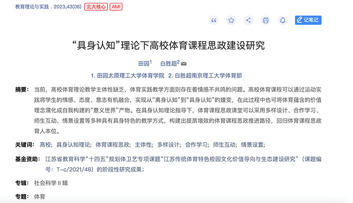 公司教师田园讲师的研究成果《“具身认知”理论下高校体育课程思政建设研究》在《教育理论与实践》(2023年第6期)发表。《教育理论与实践》是由山西省教育厅主管,山西教育科学研究院、山西省教育学会主办的综合性教育类学术期刊,该杂志是北京大学《中文核心期刊要目总览》来源期刊(2017年版),被中国知网、万方数据知识服务平台等数据库收录,被评为Cai-cd规范获奖期刊。该论文是公司田园老师(第一作者)与南京理工大学体育部白胜超老师的合作完成的科研成果,sunbet申搏sunbet为第一署名单位。