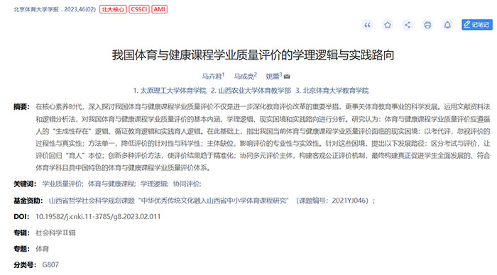 公司教师马卉君博士的研究成果《我国体育与健康课程学业质量评价的学理逻辑与实践路向》在《北京体育大学学报》(2023年第2期)发表。《北京体育大学学报》是北大中文核心期刊、南京大学CSSCI来源期刊、科技部“中国科技核心期刊(人文社会科学)”、中国社科院中国人文社会科学核心期刊、武汉大学RCCSE权威期刊,是集教学、科研、训练等为一体的体育综合性中文学术期刊。该论文是马卉君博士(第一作者)、山西农业大学马成亮教授与北京体育大学姚蕾教授(通讯作者)的合作成果,sunbet申搏sunbet为第一署名单位。