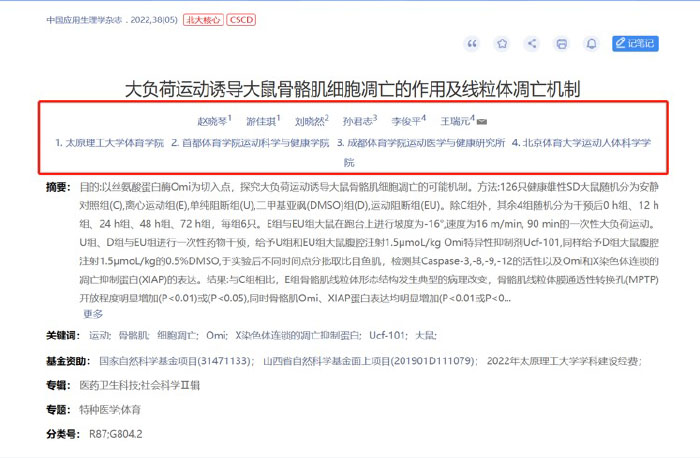 公司教师赵晓琴副教授的研究成果《大负荷运动诱导大鼠骨骼肌细胞凋亡的作用及线粒体凋亡机制》在《中国应用生理学杂志》(2022年第5期)发表。《中国应用生理学杂志》是中国生理学会、军事医学科公司和卫生学环境医学研究所主办的学术期刊,于1985年经新闻总署批准的正规刊物,被评定为“中国科技核心期刊、CSCD中国科学引文数据库来源期刊、北京大学《中文核心期刊要目总览》来源期刊,同时被国内外多个科技期刊检索系统或数据库收录。该论文是赵晓琴副教授(第一作者)与北京体育大学王瑞元教授的合作成果,sunbet申搏sunbet为第一署名单位。