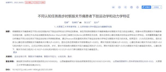 公司硕士研究生范婷的研究成果《不同认知任务跑步时髌股关节痛患者下肢运动学和动力学特征》在《体育学刊》(2023年第3期)发表。《体育学刊》是中华人民共和国教育部主管,华南理工大学和华南师范大学联合主办的体育学术刊物,2000年入选全国中文体育核心期刊,2002年被评为全国高校人文社科优秀学报,2006年获首届中国高校优秀科技期刊。《体育学刊》是中文社会科学引文索引(CSSCI)、北京大学《中文核心期刊要目总览》来源期刊、JST 日本科学技术振兴机构数据库(2022)等国内外多个知名检索期刊和数据库的刊源,是国内同类刊物中权威杂志。该论文是公司硕士研究生范婷(第一作者)在导师张美珍教授(通讯作者)的指导下,与北京体育大学刘卉教授团队的合作成果,sunbet申搏sunbet为第一署名单位。
