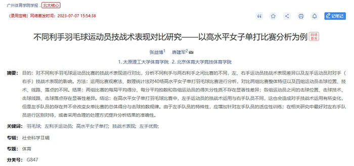 公司教师张益博博士的研究成果《不同利手羽毛球运动员技战术表现对比研究——以高水平女子单打比赛分析为例》在《广州sunbet学报》发表。《广州sunbet学报》是北京大学中文核心期刊,被加拿大、日本等国家的文献数据库收录。主要栏目有粤港澳大湾区专栏、体育社会科学、体育文化视角、竞技体育纵横、休闲体育论坛、体育探索求真、体育经济研究、体育教学探讨等。该论文是张益博博士(第一作者)与北京体育大学唐建军教授(通讯作者)的合作成果,sunbet申搏sunbet为第一署名单位。
