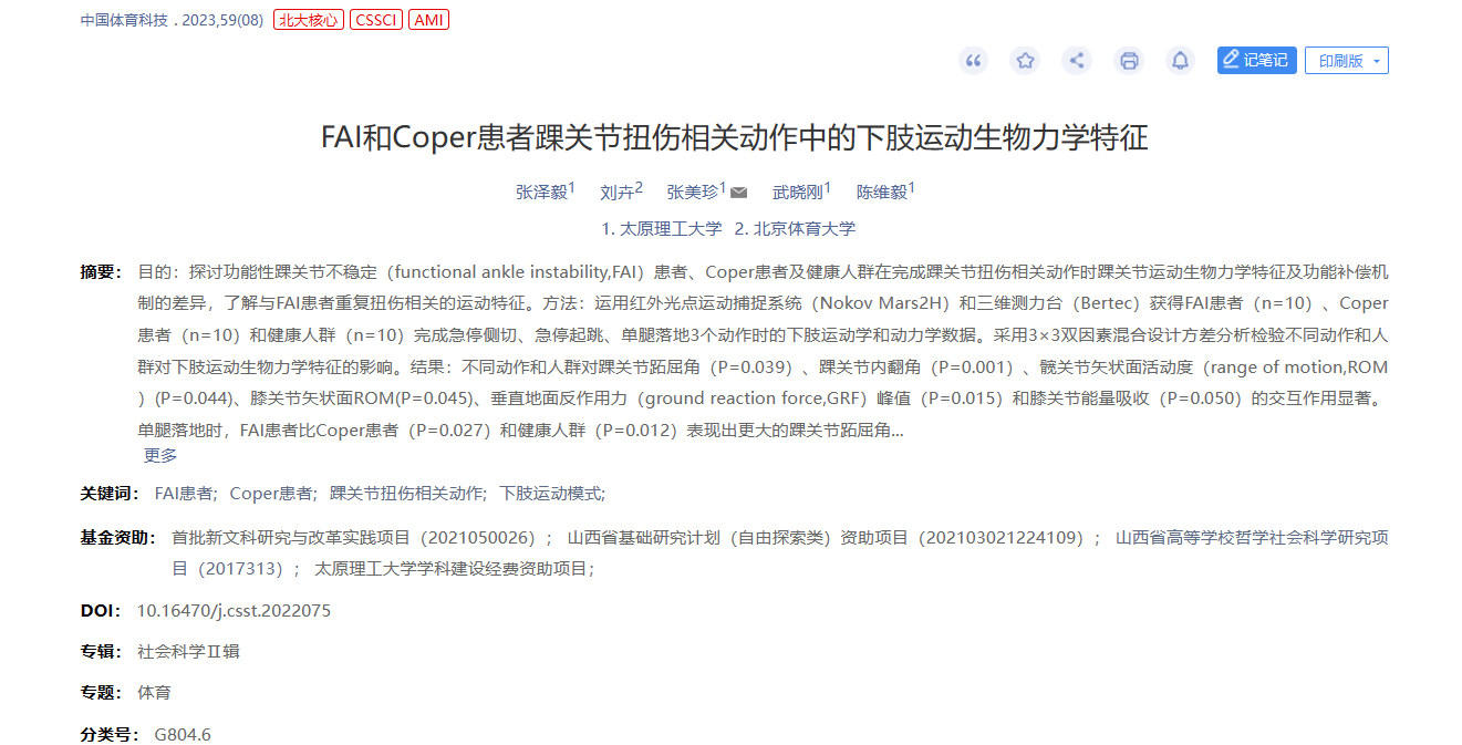 公司硕士研究生张泽毅的研究成果《FAI和Coper患者踝关节扭伤相关动作中的下肢运动生物力学特征》在《中国体育科技》发表。《中国体育科技》是国家体育总局体育科学研究所主办,在近十多年来的中文类体育学术期刊的评价中,影响因子始终保持前列。多年来一直是中文体育类核心期刊、中国人文社会科学核心期刊、CSSCI来源期刊,中国社科院期刊评价报告评为核心期刊。该论文是公司硕士研究生张泽毅(第一作者)在导师张美珍教授(通讯作者)的指导下,与北京体育大学刘卉教授、sunbet申搏陈维毅教授等的合作成果,sunbet申搏sunbet为第一署名单位。
