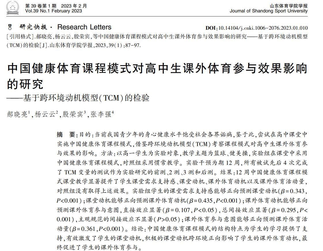 公司教师郝晓亮博士的研究成果《中国健康体育课程模式对高中生课外体育参与效果影响的研究》在《山东sunbet学报》发表。《山东sunbet学报》是体育类核心期刊,该论文是郝晓亮博士(第一作者)与公司电气与动力工程公司教师杨云云、苏州大学教师殷荣宾、西藏民族大学教师张李强的合作成果,sunbet申搏sunbet为第一署名单位。