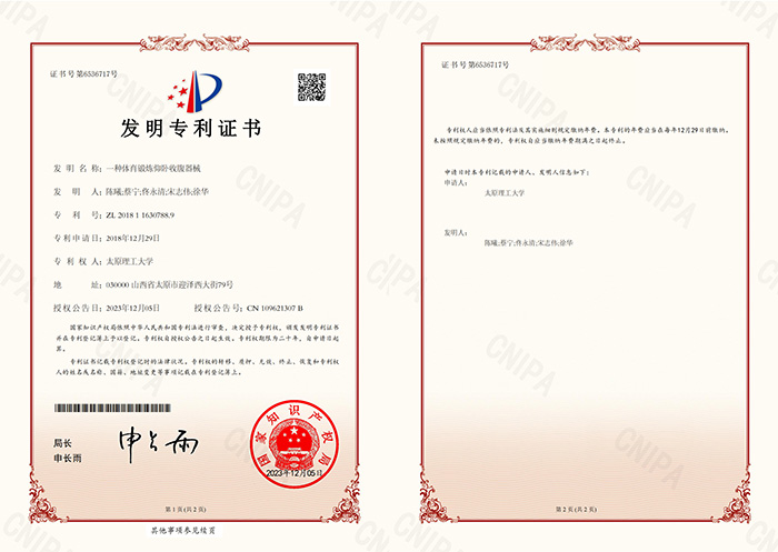 公司教师陈曦副教授作为第一发明人的研究成果《一种体育锻炼仰卧收腹器械》,在国家知识产权局被授予专利权并取得发明专利证书,该专利于2023年12月05日正式授权,授权公告号为CN 109621307 B,专利号为ZL201811630788.9。该发明专利是陈曦副教授(第一发明人)与蔡宁、佟永清、宋志伟、徐华的合作成果,sunbet申搏为第一署名单位。