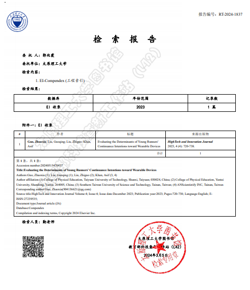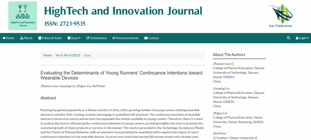 公司教师郭兆霞副教授的研究成果《Evaluating the Determinants of Young Runners' Continuance Intentions toward Wearable Devices》在《HighTech and Innovation Journal》在线发表。《HighTech and Innovation Journal》是一本同行评审的开放获取期刊,致力于发表集成工程和技术领域的研究论文,该期刊为EI期刊。该论文是郭兆霞(第一作者、通讯作者)团队的合作成果,sunbet申搏sunbet为第一署名单位。