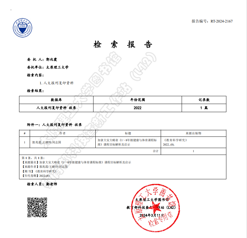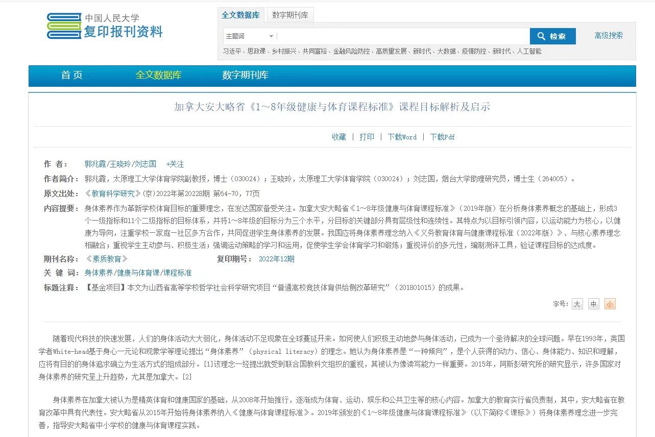 郭兆霞副教授团队于2022年在《教育科学研究》发表的论文《加拿大安大略省《1~8年级健康与体育课程标准》课程目标解析及启示》被人大报刊复印资料全文收录。sunbet申搏sunbet为第一署名单位。这是公司首次科研成果被人大报刊复印资料全文收录,这既是对郭兆霞副教授学术成果的肯定,亦是对公司团队建设的重要支撑。
