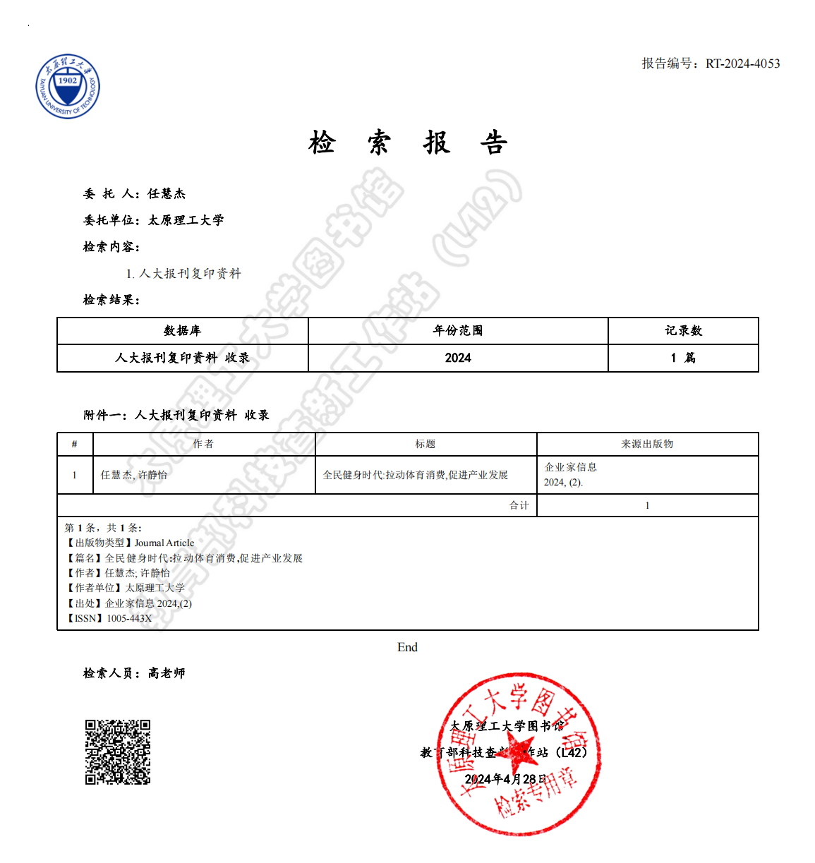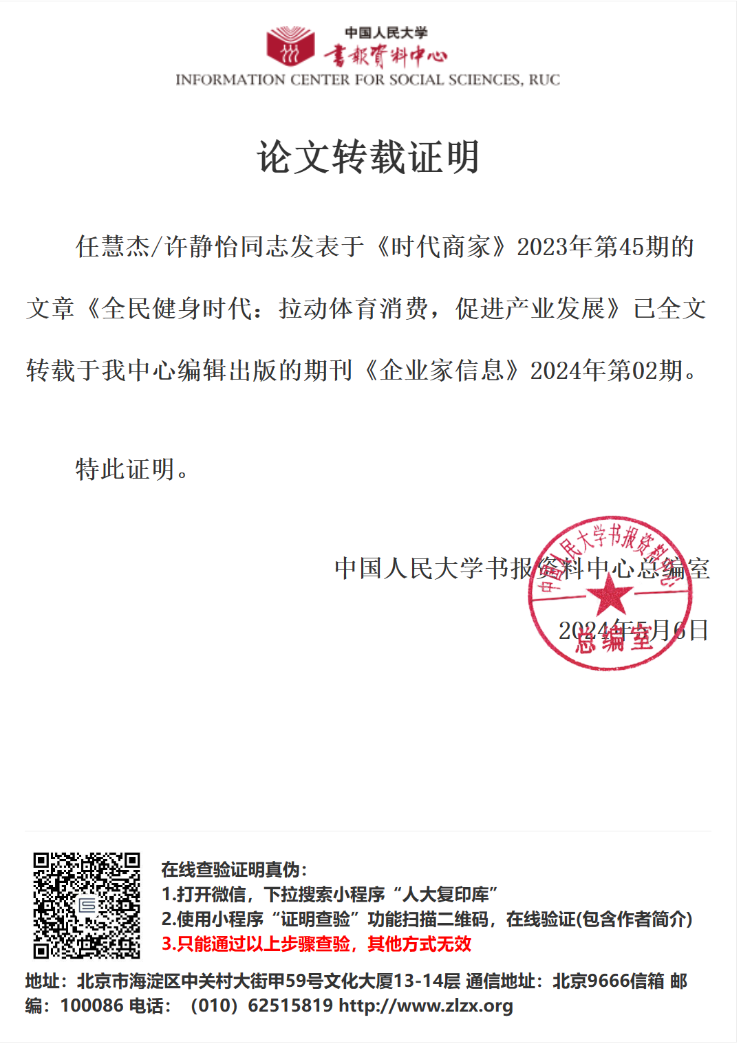 任慧杰博士团队于2023年在《时代商家》发表的论文《全民健身时代:拉动体育消费,促进产业发展》被中国人民大学复印报刊资料《企业家信息》2024年第2期全文转载,sunbet申搏sunbet为第一署名单位。