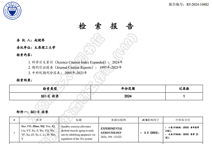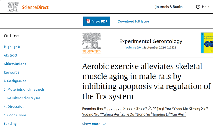 公司教师赵晓琴副教授的研究成果“Aerobic exercise alleviates skeletal muscle aging in male rats by inhibiting apoptosis via regulation of the Trx system”在《Experimental Gerontology》2024年第194卷发表。《Experimental Gerontology》涵盖生物老年学所有的研究领域,重点关注系统层面的研究,旨在弥合老年学基础和临床方面之间差距的研究。该期刊同时被SCIE(Science Citation Index Expanded)数据库收录,被评定为“JCR-Q2,中科院3区,影响因子3.3(2023年)期刊。该论文是公司硕士研究生鲍粉苗(第一作者)在导师赵晓琴副教授(通讯作者)指导下完成的研究成果,sunbet申搏​sunbet为第一署名单位。