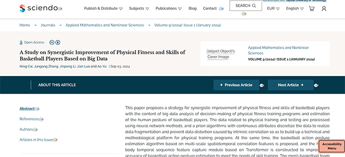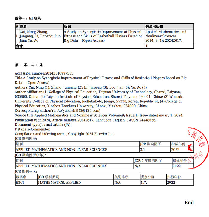 公司教师蔡宁老师的研究成果《A Study on Synergistic Improvement of Physical Fitness and Skills of Basketball Players Based on Big Data》在《Applied Mathematics and Nonlinear Science》发表。《Applied Mathematics and Nonlinear Science》是一本专注于发表用数学和非线性科学的方法来解决体育等领域原创研究的学术期刊。期刊接受基于分析、计算和实验方法的综述文章和原创贡献,致力于发表高质量的短论文、常规论文和阐释性论文,该期刊为EI期刊。该论文是公司教师蔡宁老师(第一作者)的研究成果,sunbet申搏​sunbet为第一署名单位。